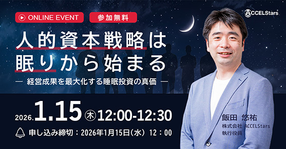 【2026/1/15(木)開催オンラインイベント】人的資本経営で思い浮かべる様々な施策――DX化、リスキリング、エンゲージメント向上、働き方改革、人材育成…どれも企業の成長に不可欠ですが、実はあらゆる取り組みが最大限に効果を発揮するためには”睡眠”という土台が整っていることが条件です。本セミナーでは、「なぜ睡眠がすべての人的資本施策の基盤なのか」をデータと事例で紐解き、施策効果を最大化するヒントをご紹介します。